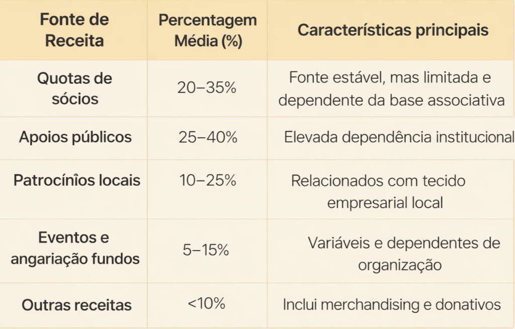 Entre as principais fontes de receita, destacam-se as quotas dos sócios, que, embora importantes, tendem a ser reduzidas e irregulares, muito pelo contexto local, pela diversificação da oferta e pela instabilidade financeira global. A base associativa de muitos clubes é envelhecida, o que limita a capacidade de crescimento desta fonte de financiamento.
