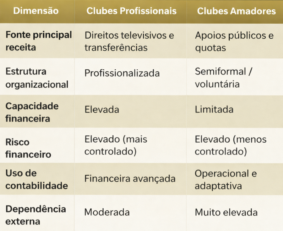 A comparação apresentada na Tabela 1 permite compreender que, embora a contabilidade criativa exista em ambos os contextos, a sua natureza difere substancialmente. Nos clubes profissionais, está frequentemente associada a engenharia financeira complexa, enquanto nos clubes amadores assume uma dimensão mais operacional e pragmática.