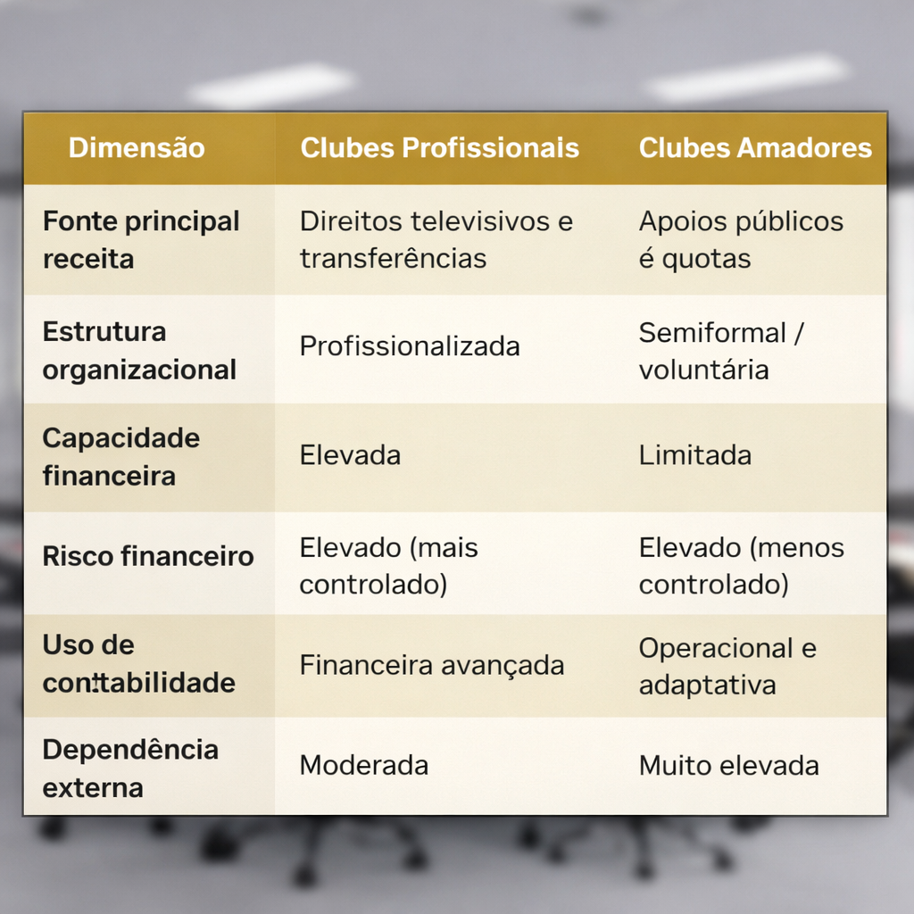 A análise da estrutura financeira dos clubes de futebol amadores revela um padrão comum de fragilidade e dependência externa, sendo que as receitas são, em grande medida, limitadas e voláteis e frequentemente insuficientes para cobrir os custos operacionais dos clubes ao longo das épocas desportivas.
